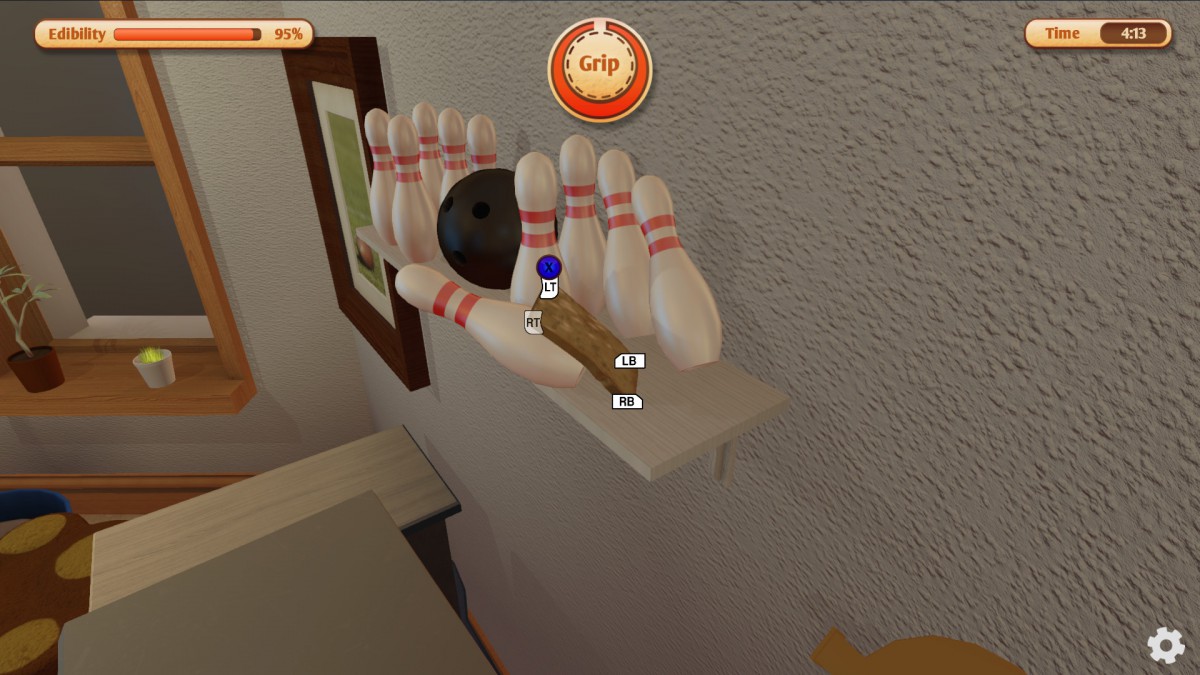 Controlling the bread is simple; each corner of the slice is allocated to a shoulder button. As long as a corner is making contact with a surface you’re allowed to effectively cling on by holding the appropriate shoulder button and then drag your way through by pushing the left stick in the appropriate direction. If you have matching shoulder buttons down you’ll be able to flip yourself across areas. It sounds complicated, but it’s really not – it’s actually the most accurate representation of bread controls I think we’ll ever come across in a game. You’re also able to attach to stationary objects and move them around – I caused a lot of destruction on my journeys be it smashing plates and glasses or in one case dropping a bowling ball onto a TV, the inevitable destruction creating a makeshift toaster in the process.